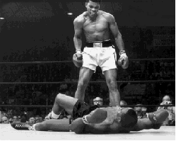 Mohammed Ali slaat in 1965 in de eerste ronde favoriet Sonny Liston knock out. Mohammed Ali schreeuwde op het moment dat deze foto genomen werd: "Stand up and fight, you sucker!"